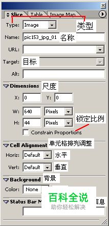 Name 在这里输入热区的名称 URL 输入图片的URL Target 目标 Dimensions 尺寸,这个选项调整热区的X、Y值与长宽值。 Constrain Proportios 锁定长宽比例 Cell Alignment 单元格排列调整。在这里有Horiz(水平)和Vert(垂直)的热区排列调整选项供大家选择。 Background 背景,在此选项中设定热区的背景颜色。 Status Bar Message 热区在状态栏显示的信息