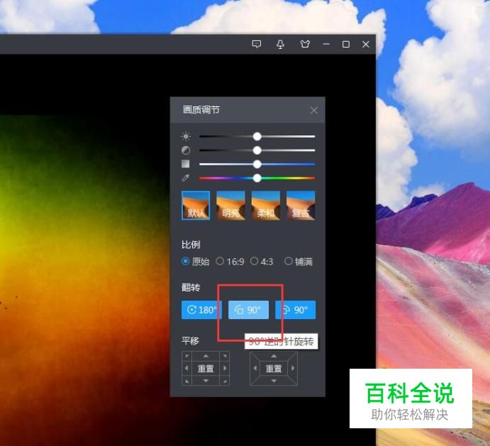 接下来将弹出画质调节选项,点击设置中的页面翻转功能按钮,然后即可实现视频播放方向的调整。