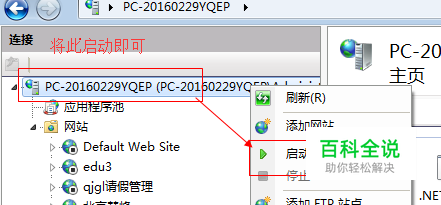 这时因为服务器没有启动,而由于这个服务本身就在iis里面,所以直接启动就可以了。具体方法是找到本机的计算机名,右击,在弹出的下拉列表找到启动并单击就可以了。