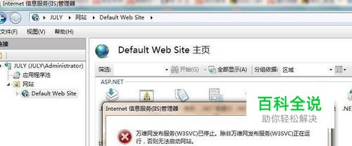 当我们在iis中启动网站时,出现W3SVC已停止,除非W3SVC正在运行,否则无法启动网站的错误提示框,这时我们应该怎么办?这是由于iis这个服务没有启动,我们只需在iis中启动这个网站就可以了。