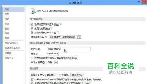 在打开的“Word选项”对话框中切换到“常规”选项卡,然后在“对Microsoft Office进行个性化设置”区域设置“用户名”和“缩写”选项,并单击“确定”按钮,如图所示。