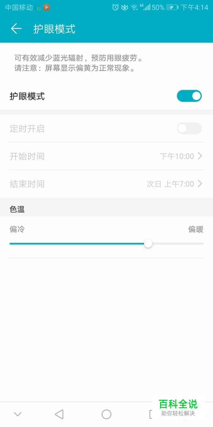 点击护眼模式右侧的打开按钮即可完成设置,拖动下方的色温显示条可以调整屏幕亮度。