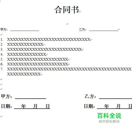 然后输入“甲方乙方”后面跟【下划线】。 甲方乙方的下面写上“日期”,日期可以在文字“年月日”中加入【下划线】。 这样一份合同的模板就完成了。