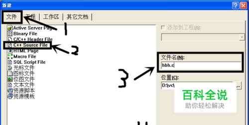 在对话框中->文件->C++ Source File->文件名hbh.c->确定。