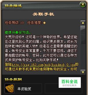 金色任务是“功能任务”,它的优先级是大荒任务里最高的,若你在大荒世界里遇到NPC头顶上的金色问号,请务必完成,他会对你的大荒之旅有着极大的帮助。 功能任务,顾名思议就是完成此任务能获得一些游戏内或者游戏外的功能,例如手机的绑定,使帐号安全得到极大的保障,还有灵兽骑任务,只要完成此任务才能使自己的灵兽获得。