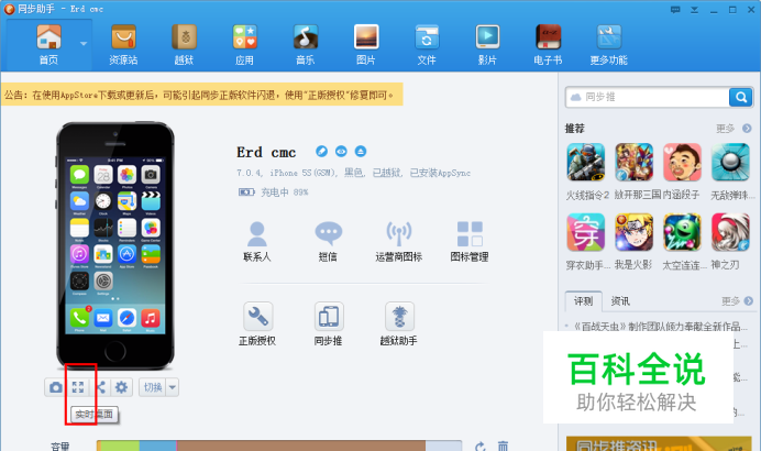 分享教程:教大家用iphone,touch轻松实现与电脑实时桌面! 首先声明这个帖子是我在网上看的,自己试了觉得很好玩,分享给大家~ ------------------------------------------------------------------------------------------ 这个方法是我偶然间发现的,请不要误以为我是技术帝。。所以可能描述得有点不清楚,反正就是让iphone或者touch,ipad的屏幕实时投射在电脑屏幕上,就像学校多媒体投影样~~~不过没那么复杂需要花几百元购买转接头什么的,只需要电脑+数据线+手机即可!上张效果图: 借助工具:同步助手方法:设备连接电脑,打开同步助手:看到设备下方的画圈的”实时桌面“ 点开就好了~教程结束...就那么简单。。求轻拍。。。。最后再上两张效果图,大屏就是不一样的感觉!虽然有一点点延迟,但是开狂野飙车很爽啊!!看电影也非常GOOD!唯一遗憾就是木有声音。需要手机开音量来辅助。