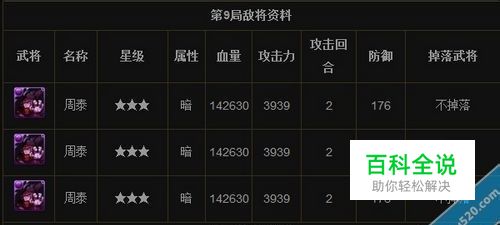 本关的难度比上一个战场提升了一个台阶。第九回合的3周泰与最后BOSS的白虎都是非常麻烦的对手。2回合的周泰与1回合的白虎要求你的回复必须要高,否则就是要暴力队将其碾压。 由于大部分玩家都是非R或者小R,这里只介绍较为平民的打法。 这里用的是双单减的方法过本,即光减半+暗减半。 (图中武将只为推荐,具体依照玩家拥有武将情况替换) 这样可以保证不会被3周泰合击而死(减半后合击伤害为5908),且白虎每回合伤害也会减少至3305,这样只要你保证,遇到兽首与胖子合击的时候能优先将其一杀死,你就不会有什么危险。 在白虎的战斗中尽量不要拖拉太9,否则断了心珠,队友的奶技能也CD很容易死亡。