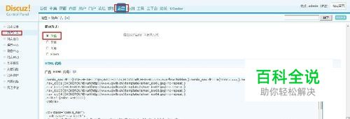 然后将下面的代码放入到 广告HTMl 代码 框中,具体代码如下: <style> .comiis_nav{BACKGROUND:#f7f9fb repeat-x;border:1px solid #e2eaf1;border-top:0px solid #e2eaf1;HEIGHT:57px;overflow:hidden;padding-left:15px;} .comiis_nav dt{WIDTH:207px;HEIGHT:50px;FLOAT:left;overflow:hidden;padding-left:48px;padding-top:6px;} .comiis_nav dt LI{LINE-HEIGHT:22px;WIDTH:65px;FLOAT:left;HEIGHT:22px;overflow:hidden;}.comiis_nav dt LI a{color:#555;}.comiis_nav dt LI a:hover{color:#369;} .nav_ico01{BACKGROUND:url(http://www.cjwlb.cn//template/ls/nav_ico01.jpg) no-repeat;} .nav_ico02{BACKGROUND:url(http://www.cjwlb.cn//template/ls/nav_ico02.jpg) no-repeat;} .nav_ico03{BACKGROUND:url(http://www.cjwlb.cn//template/ls/nav_ico03.jpg) no-repeat;} .nav_ico04{BACKGROUND:url(http://www.cjwlb.cn//template/ls/nav_ico04.jpg) no-repeat;} .STYLE1 {color: #FF0000} </style> <div class="comiis_nav"> <dt class="nav_ico01"> <li><A href="http://www.cjwlb.cn/forum-qlgg-1.html" target=_blank>企业广告</A></li> <li><A href="http://www.cjwlb.cn/forum-ylgg-1.html" target=_blank>医疗广告</A></li> <li><A href="http://www.cjwlb.cn/forum-rwgg-1.html" target=_blank>软文广告</A></li> <li><A href="http://www.cjwlb.cn/forum-wlgg-1.html" target=_blank>网络广告</A></li> <li><A href="http://www.cjwlb.cn/forum-wzgg-1.html" target=_blank>网赚广告</A></li> <li><A href="http://www.cjwlb.cn/forum-tbkgg-1.html" target=_blank>淘宝客广告</A></li> </dt> <dt class="nav_ico03"> <li><A href="http://www.cjwlb.cn/forum-smdq-1.html" target=_blank>数码电器</A></li> <li><A href="http://www.cjwlb.cn/forum-zxmr-1.html" target=_blank>整形美容</A></li> <li><A href="http://www.cjwlb.cn/forum-SEOjl-1.html" target=_blank>SEO交流</A></li> <li><A href="http://www.cjwlb.cn/forum-qczj-1.html" target=_blank>汽车之家</A></li> <li><a href="http://www.cjwlb.cn/forum-jkys-1.html" target="_blank">健康养生</a></li> <li><A href="http://www.cjwlb.cn/forum-51-1.html" target=_blank>友链交换</A></li> </dt> <dt class="nav_ico04" style="width:130px;"> <li><A href="http://www.cjwlb.cn/forum-SEOjdq-1.html" target=_blank>SEO接单区</A></li> <li><A href="http://www.cjwlb.cn/forum-55-1.html" target=_blank>论坛茶馆</A></li> <li><A href="http://www.cjwlb.cn/forum-52-1.html" target=_blank>链接买卖</A></li> <li><A href="#">论坛微博</A></li> </dt> <dt class="nav_ico02" style="width:75px;"> <li><A href="http://www.cjwlb.cn/forum-56-1.html" target=_blank>意见交流</A></li> <li><A href="http://www.cjwlb.cn/forum-57-1.html" target=_blank>最新公告</A></li> </dt> <SCRIPT type=text/javascript> (function(){ var today=new Date(); var weekArr=[ "星期日", "星期一", "星期二", "星期三", "星期四", "星期五", "星期六"]; document.write( today.getFullYear(),"年", today.getMonth()+1,"月", today.getDate(),"日 ", weekArr[today.getDay()]); })(); </SCRIPT> </DIV>
