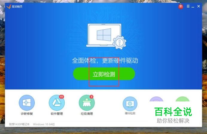 这里我们使用驱动精灵软件来安装无线网卡驱动程序,双击打开驱动精灵软件主页面,选择“立即检测”菜单。