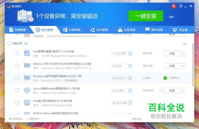 接下来,查看无线网卡设备的驱动程序安装情况,点击“升级”按钮。
