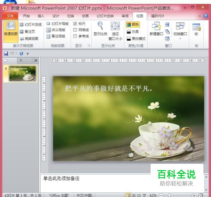 我们先看最简单的方法。 其实打开PPT时,我们就可以看到,在PPT底端有一块带有”单击此处添加备注“字样的文本框,我们可以直接在此处添加备注