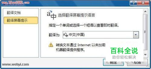 单击“翻译”按钮,在下拉菜单中选择“选择转换语言”,弹出“翻译语言选项”窗口,切换到“翻译屏幕提示”标签卡,打开“翻译为”右侧的下拉框,选择一种目标语言。例如想将其它语言翻译中简体中文,这里就选择“中文(中国)”,然后单击“确定”按钮(如图2),关闭“翻译语言选项”窗口,返回Word 2010编辑窗口。 图2选择转换语言