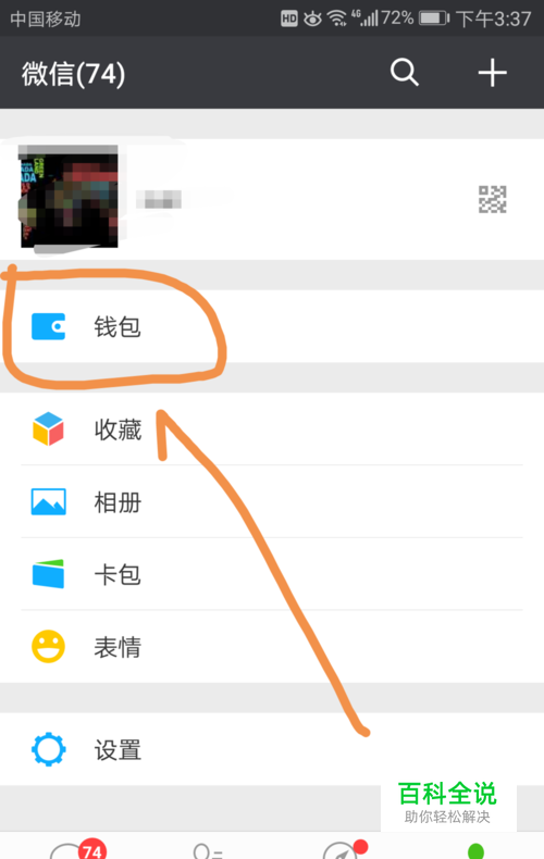 进入我的钱包界面后点按箭头指向的理财通标志。