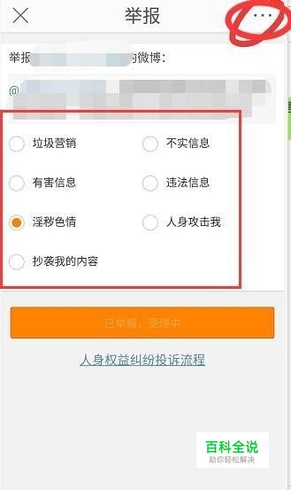 用浏览器打开后,可以看到顶部的文字标题为举报微博,一定要用浏览器打开才可以。