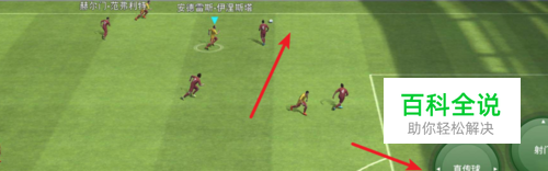 手游版上,也有二过一的技巧,但操作起来稍有点复杂,我们在按传球键时,也是轻拂一个摇杆,这样我们传球的队员会向前跑,另一个队友在接到球后,按一下直传键,就可以了。