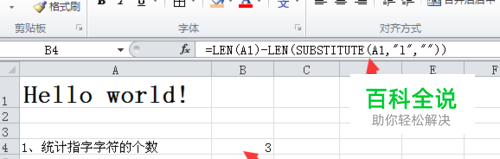 这个题目有个非常取巧的方法,我们不用去一个个数它的个数,而只要知道它占几个位置就可以了,那么我们首先用len()计算出字符串长度=len(A),结果是12.然后用substitute()把l替换成""(相当于把它从字符串中删除了),再用len()求出替换后字符串长度:=LEN(SUBSTITUTE(A1,"l",""),结果是9,两个结果相减,最后求出l的个数为3!完整公式:=LEN(A1)-LEN(SUBSTITUTE(A1,"l",""))