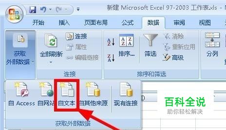 点击“数据”选项卡左侧的“获取外部数据”下拉菜单,选择菜单中的“自文本”选项,如图:
