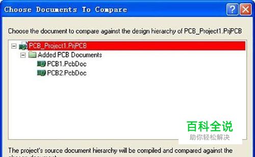 在原理图环境下,上面的菜单中选择 Project->Show Differences,弹出Choose Documents to Compare对话框: