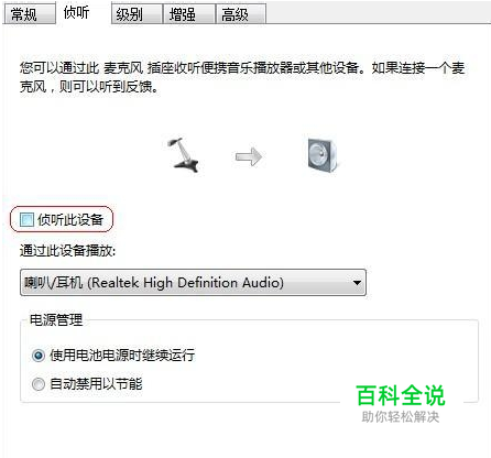 麦克风属性”在“侦听”中,找到“侦听此设备”,若打钩,请把钩去掉