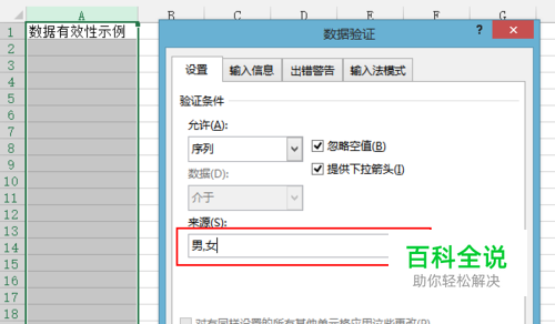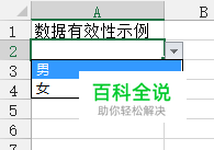 输入完毕,点击确定,你会发现当前单元列只允许输入你自定义的男女(你也可以自定义其它内容),这样,就简化了你的输入时间,也避免输入出错。