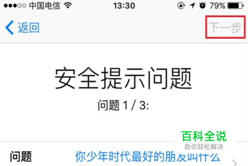 输入Apple ID的密码,这里要选择三个安全问题进行设置,安全问题是用来找回密码的,所以我们一定要牢记,选择问题后输入答案,点击右上角的“下一步”。