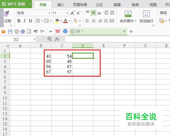 首先,我们打开我们电脑上面的wps表格,然后我们在里面输入一些数字,之后我们选中图示中的单元格;