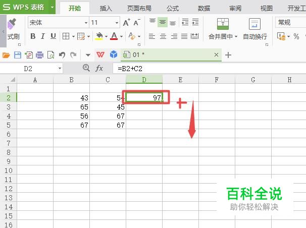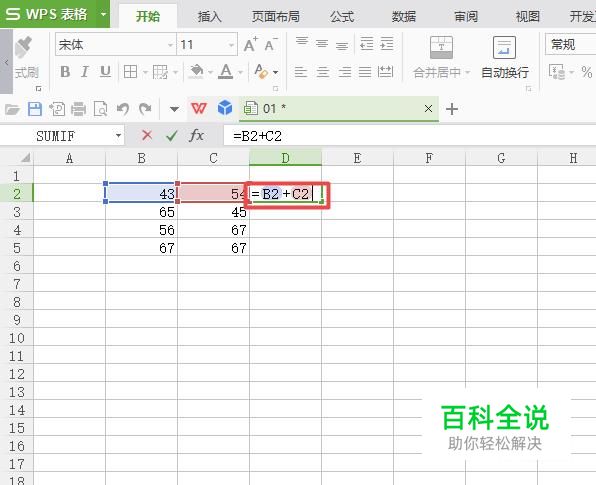 然后我们在该单元格中输入=B2+C2,然后我们按回车键;