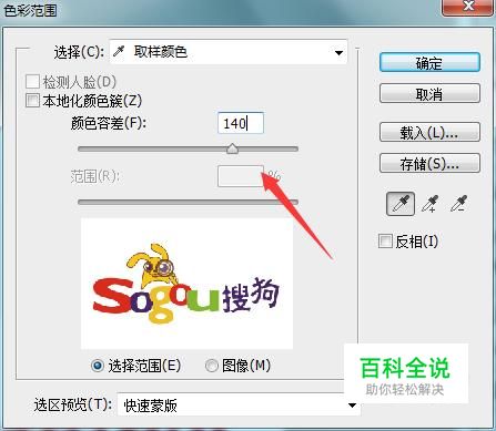 点击色彩范围选项使用吸管工具吸取背景色,然后设置颜色容差值如图所示: