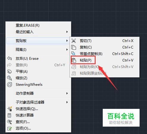 点击复制选项之后,打开CAD在绘图区里我们单击鼠标右键找到粘贴选项,如图所示: