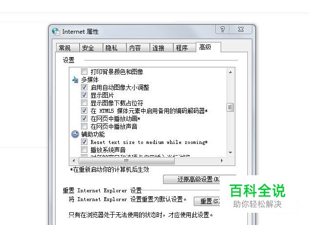 在高级选项下找到多媒体,在多媒体选项里面找到最后一个在网页中播放声音选项,此时这个选项的前面是有对勾的,用鼠标点击一下,把对勾取消,然后点击确定,网页声音就关闭了。