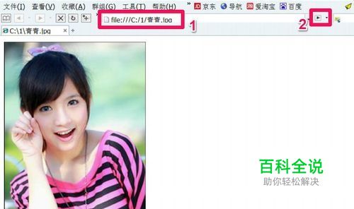 2,然后在地址栏中输入存放照片的路径,我的照片是放在C:\1文件夹下,名为青青.jpg,所以在地址栏中输入C:\1\青青.jpg,然后按“转到”按钮,即可加载照片。