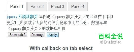 <divclass="wrap"> <h2>Basic tabs example</h2> <divclass="set set-1"> <divclass="panel panel-1"> <h2>Panel 1</h2> <p><a href="/article_fenye_19.html">jquery 无刷新翻页</a> 本例与《jquery 翻页分页》的区别在于本例更实用,翻页数字太多的时候会隐藏中间的部分。数据库与《jquery 翻页分页》的数据库相同</p> <buttonclass="btn">Show tab 3</button> <buttonclass="destroy">Destroy</button> <buttonclass="apply">Apply</button> </div> <divclass="panel panel-2"> <h2>Panel 2</h2> <p>2</p> </div> <divclass="panel panel-3"> <h2>Panel 3</h2> <p>3</p> </div> <divclass="panel panel-4"> <h2>Panel 4</h2> <p>4</p> </div> </div> <h2>With callback on tab select</h2> <divclass="set set-2"> <divclass="panel panel-1"> <headerclass="heading">Panel 1</header> <p>1</p> <buttonclass="btn">Show tab 2</button> </div> <divclass="panel panel-2"> <headerclass="head">Panel 2</header> <p>2</p> </div> <divclass="panel panel-3"> <headerclass="h1">Panel 3</header> <p>3</p> </div> </div> </div> JavaScript Code <script> $(function() { $(".set-1").mtabs(); $(".set-2").mtabs({ tab_text_el: ".heading, .head, header", onTabSelect: function(idx) { console.log("Selected tab is: " + idx); }, onReady: function () { console.log('Set 2 ready!'); } }); $('.set-1 .panel-1 .btn').on('click', function(event) { $('.set-1').mtabs('show', 2); event.preventDefault(); }); $('.set-1 .panel-1 .destroy').on('click', function(event) { $('.set-1').mtabs('destroy'); event.preventDefault(); }); $('.set-1 .panel-1 .apply').on('click', function(event) { $('.set-1').mtabs(); event.preventDefault(); }); $('.set-2 .panel-1 .btn').on('click', function(event) { $('.set-2').mtabs('show', 1); event.preventDefault(); }); }); </script>