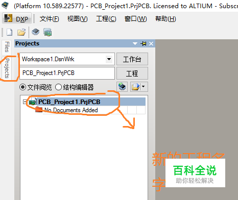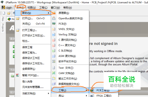 一,打开软件,新建工程 点击软件菜单栏“文件”选项→“新的”选项→“工程”选项→“PCB工程”,即可建立一个新的工程。 新的工程会显示在软件左侧的侧边栏“project”里面,如下图所示: