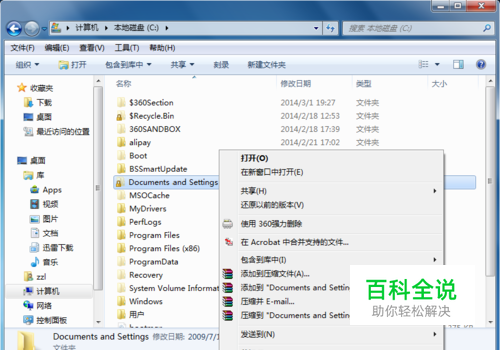 左键点击Documents and Settings文件夹,选中,然后点击右键,选择 属性,如下图所示!