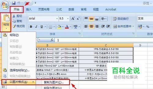 切换到“开始”标签,找到“粘贴”工具,在“粘贴”下拉列表中,选择“以图片格式”,“复制为图片”。
