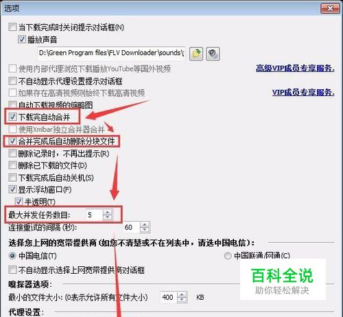在弹出的选项窗口中: 勾选“下载完自动合并”; 勾选“合并完成后自动删除分块文件”; 设置“最大并发任务数目”,即可同时下载的视频数; 点击“确定”退出。