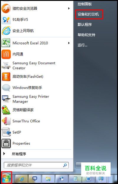1.将电脑和打印机用USB数据线连接,然后把打印机驱动光盘插入CD-ROM驱动器进行安装打印机驱动(如没有打印机驱动光盘,请点击这里下载该驱动程序)。 2.驱动安装完毕后,点击电脑左下角的【开始】菜单项,找到【设备和打印机】(Windows 8系统点击菜单快捷键【Win】+【C】组合键-【设置】-【控制面板】-【查看设备和打印机】)。这里以【Windows 7】系统为例。