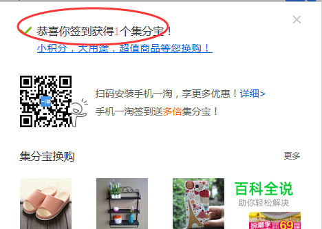 第四步:签到成功后会有提示(第一次签到得了1个),除此之外还有多种方法可以获得集分宝:做任务领取,其他平台的积分兑换,购物时可以赚集分宝,亲们可以多多选择,多多利用哦