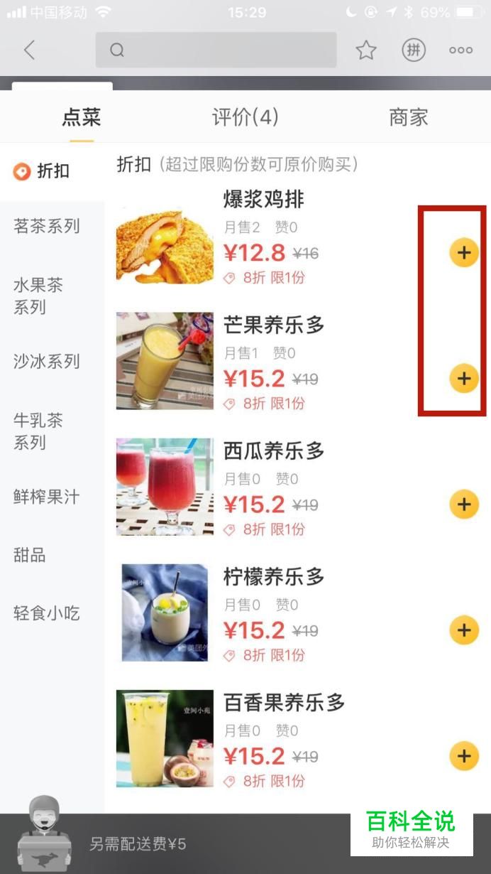 然后点击我们要购买的外卖右侧的加号键将商品添加到购物车,如下图所示。