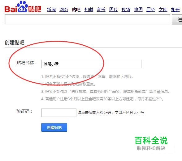 贴吧名称 然后输入要创建的【贴吧名称】,比如【蜡笔小新】,如下图所示: