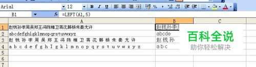 有几个字符串如下图:我们要从字符串的左边开始取5个字符,公式应为:=LEFT(A1,5)。