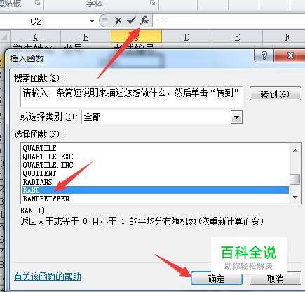 点击插入函数按钮,点击列表框中的RAND函数,确定。