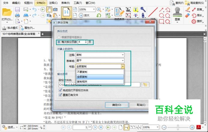点击后,弹出拆分文档设置框。在设置框中,我们从上至下对拆分条件进行设置。首先勾选每次拆分页数,在后面的文本框中输入数字,这里小编输入4,表示每一个拆分文档有四个页面。而在对象上的动作设置中,我们可以设置拆分文档是否保留被拆分文档的注释、表单域和书签。