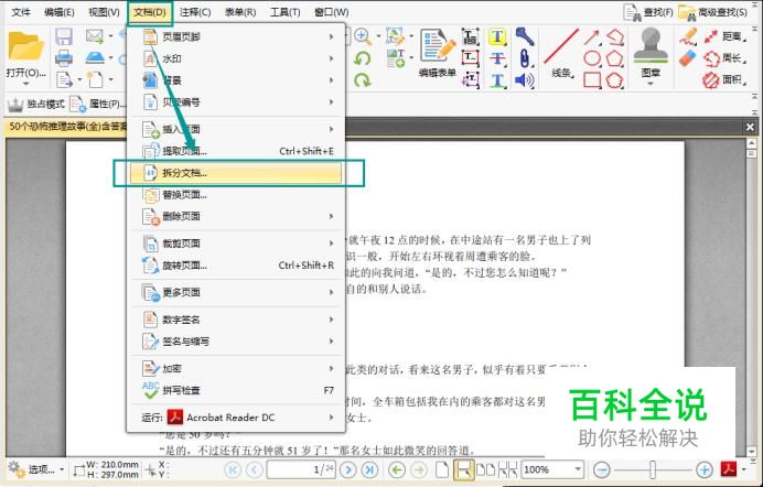 pdf文档打开后,点击界面上方的文档按钮,随后在弹出的目录中找到拆分文档并点击。