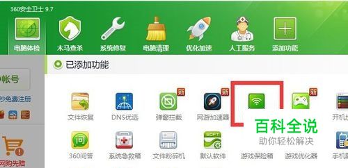 360免费WiFi手机版下载方法:打开“360安全卫士”,在“更多功能”列表中点击“免费WiFi”按钮,即可开启电脑版Wifi创建工具。