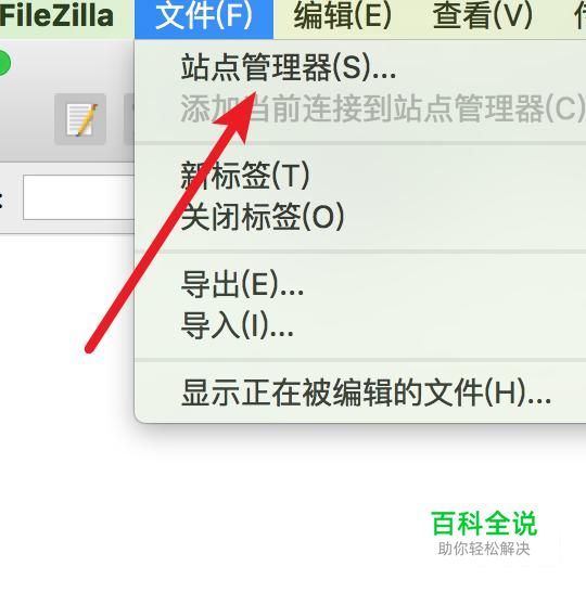 打开FileZilla客户端工具。(没有的可以搜狗搜索,然后下载安装一个)。 点击‘文件’下的‘站点管理器’。