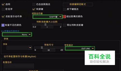 最下面的动作条配置保存与恢复块将利用MySlot插件为用户提供动作条配置方案的保存和载入。 点击动作条旁边的 + 号可以看到每个子动作条的设置。