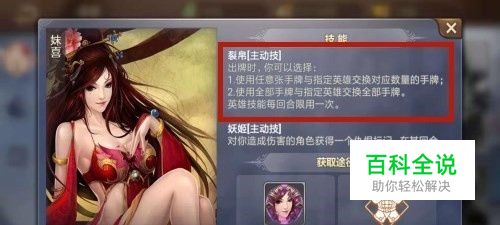 妹喜的主技能可以用自己的牌与在场英雄进行交换,把自己手牌中的数张或全部进行交换。