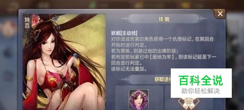 当有人对妹喜造成伤害后,当轮到该英雄出牌时会进行判定,如果是黑桃牌,则这个英雄不能出牌。