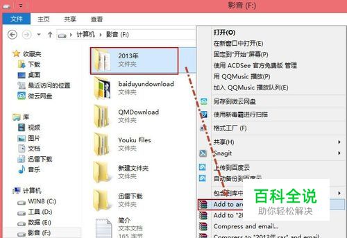 选中“2013年”文件夹,然后右击选择“Add to archive”(添加到压缩文件)。